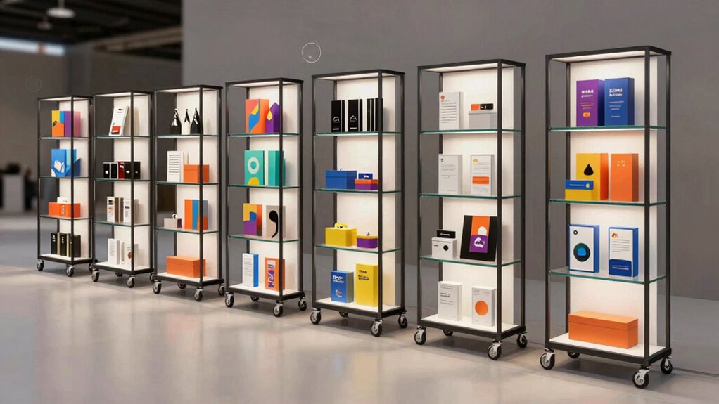 Choosing event display shelves with wheels requires careful attention to their durability and material quality, as these factors directly influence their lifespan and performance. High-quality materials like stainless steel, powder-coated steel, or rust-resistant iron considerably extend the shelves’ longevity. These durable constructions ensure the shelves can support heavy loads without bending or breaking over time. Impact-resistant and corrosion-proof materials are essential for withstanding frequent transportation and exposure to various environmental conditions. Well-made wheels and locking mechanisms also play a key role in stability and safety during use and movement. Ultimately, the choice of quality materials directly affects the shelf’s resistance to wear, rust, and damage, helping it maintain a professional appearance through extended use.