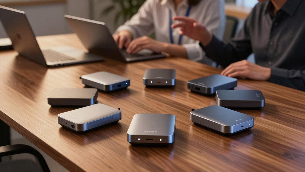 When selecting a mini router for your sales team, I consider compatibility with your devices and the security features you need to protect sensitive data. Power and portability are also essential, along with connection speed requirements and versatile modes for different situations. Thinking through these factors helps guarantee you choose a device that keeps your team connected and secure on the go.