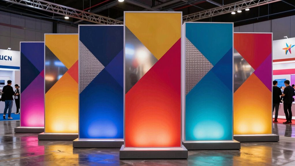 Choosing the right size for a trade show backdrop is essential to creating an effective and professional display. It needs to fit your booth without overwhelming or underwhelming the space. Larger backdrops, like 7.5 x 10 feet, make a strong visual impact but require more effort and room for setup. Smaller options, such as 8 x 8 feet, are more manageable for limited booth areas while still maintaining a professional look. Adjustable backdrops with telescoping frames offer flexibility, letting you customize dimensions to suit various booth sizes and event requirements. To determine the ideal size, consider your overall booth dimensions and the distance from which attendees will view your display. Proper sizing maximizes visibility and guarantees your branding stands out effectively.